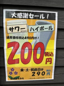 生ビールはたぶん290円、ハイボール、サワーは200円(金祝前日は290円。生ビールは不明)