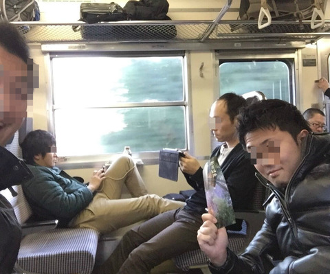 水上駅から帰りの電車。女子との混浴自撮りの夢やぶれた男たち。この帰りの電車に女子一人いるだけで盛り上がりが圧倒的に違うのだが・・笑。