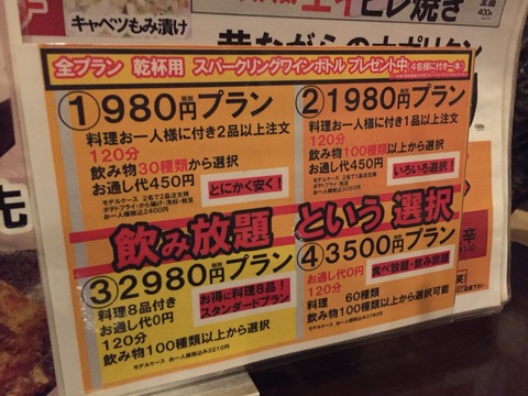 飲み放題メニュー。生ビールが100円だと思うと全然お得さを感じない笑。