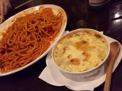 そして!隣の人が注文しているのを気になっていた「昔ながらのナポリタン 横綱盛り」1000円。なんと2000gありますよ!でかい!せんべろガールズも思わず撮影。タバスコもどさくさに紛れてでかい!