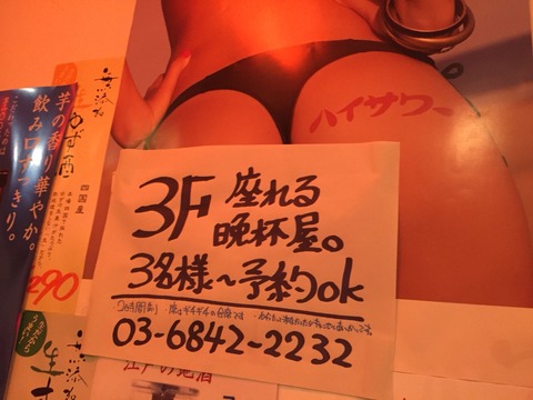晩杯屋は立ち飲み専門だが、なんと、この渋谷道玄坂店の3Fは座れるし、しかも予約できるのです!ハイサワーのおしり!