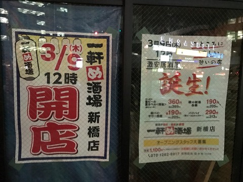 近寄ってみると・・・なんと!養老の瀧のかわりに「一軒め酒場」が3/9 12時に開店するとのこと!「一軒め酒場」と言えば、街の至るところに存在する激安酒場。「一軒め」などと言うわりには、たいがい「0次会」か「3次会」でさくっと飲む時に来店する非常にリーズナブルな酒場だ。※0次会で行くってことはまさに一軒目なんだけど笑。そういえば、呑兵衛の聖地・新橋には「一軒め酒場」は存在してなかった。まさに満を持しての開店と言える。