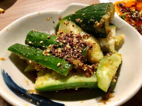 「しびれきゅうり」180円。安い!かかっているスパイスみたいなのがうまい。